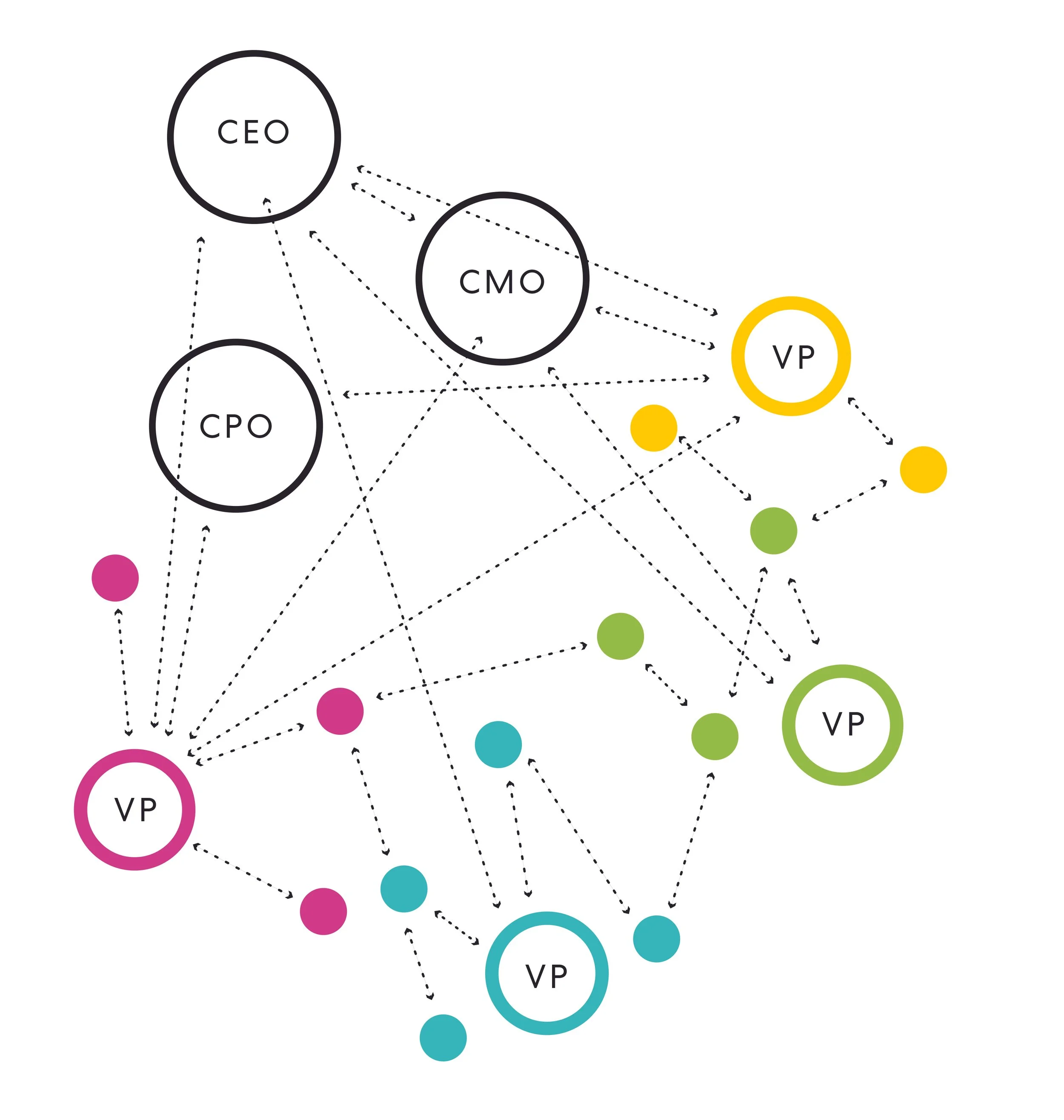 The graphic to the right illustrates a general structure that had evolved over the previous 10 years. Every team had a micro view of their KPIs, communication was inefficient, occuring through heavy C-level involvement and through “one-off” conversations from team to team. Multiple approvers were included for individual projects (always tough to navigate around), and brand goals were seen as exlcusive to business goals.